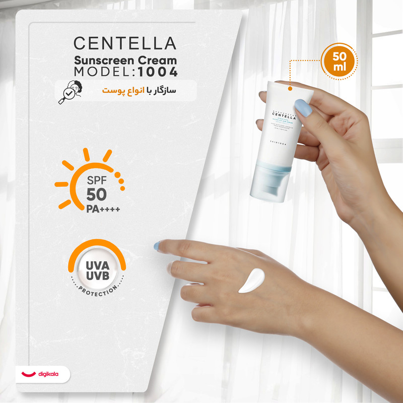 کرم ضد آفتاب بدون رنگ سنتلا، 50 SPF، مدل 1004، مناسب پوست حساس، نرمال و خشک و حجم 50 میلی‌لیتر، محافظت کننده در برابر اشعه UVA و UVB، بدون تست حیوانی، ++++PA، آبرسان، ضد التهاب، با ماندگاری 3 ساعته
