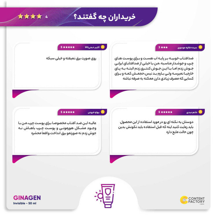 کرم ضد آفتاب ژیناژن سری OLY SKIN مدل INVISIBLE، یک کرم ضد آفتاب بسیار عالی برای استفاده در تمامی چهار فصل است. این کرم با فرمولاسیون پیشرفتهای تولید شده است که به شما کمک می کند از موج و مزاحمات آفتاب پوست خود را حفاظت کنید. این کرم ضد آفتاب با مشخصه برجسته مخفی Invisible، بدون جا گذاشتن روی پوست، قابل جذب و راحت به پوست شما نفوذ می کند. کرم ضد آفتاب ژیناژن سری OLY SKIN مدل INVISIBLE حاوی مواد مغذی، آنتیاکسیدانها و عوامل مرطوب کنندهای است که باعث تغذیه پوست و جلوگیری از خشکی و ترکهای ناشی از اشعه UV میشود. همچنین، با استفاده از این کرم ضد آفتاب، پوست شما از ایجاد لک و پیری پوست جلوگیری میشود. مزایای دیگر این کرم ضد آفتاب شامل ضد آب و براق بودن پوست شما بعد از استفاده از این محصول است. همچنین، این کرم ضد آفتاب، حاوی عوامل محافظتی مناسبی برای پوست شما است که در برابر اشعههای UV موثر هستند. به طور کلی، کرم ضد آفتاب ژیناژن سری OLY SKIN مدل INVISIBLE، یک محصول بی نظیر است که از تمامی جنبههای پوستی شما مراقبت میکند. با استفاده روزانه از این کرم ضد آفتاب، پوست شما بسیاری از مشکلات خود را فراموش خواهد کرد.