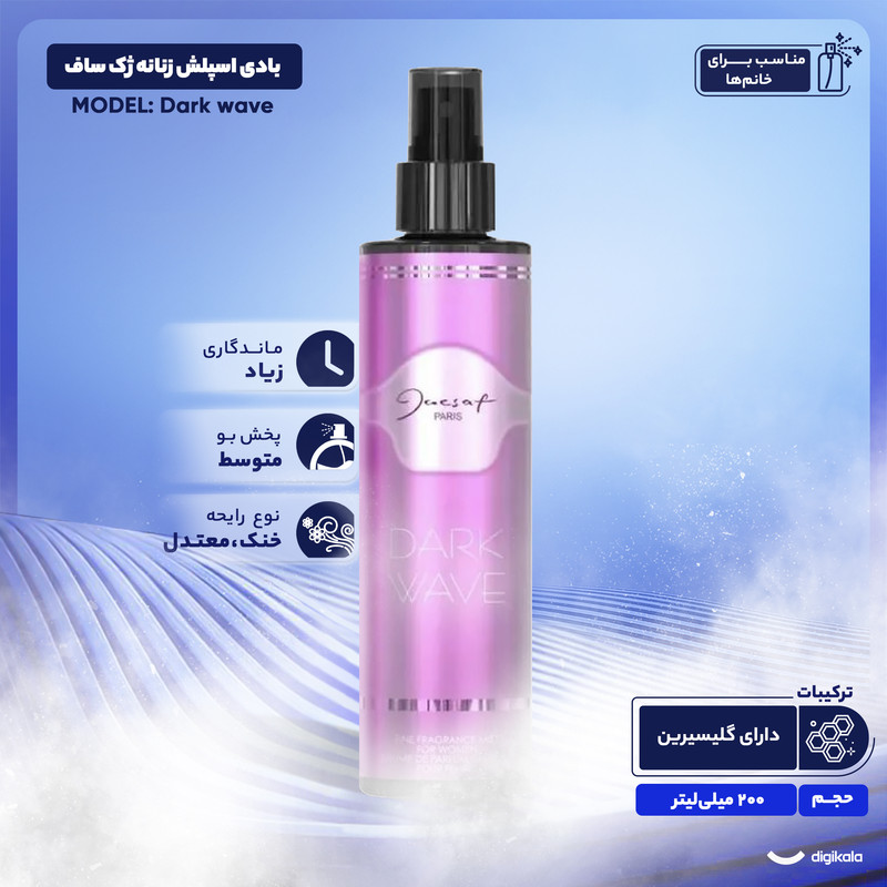 بادی اسپلش دارک ویو از برند معتبر ژک ساف (Jacsaf) با حجم ۲۰۰ میلیلیتر، رایحهای محبوب و همسو با عطر لانوین اکلت دی آرپج دارد. این محصول گلی و میوهای، ماندگاری و پخش بوی بسیار خوبی دارد و گزینهای عالی برای خانمهای جوان است. کیفیت بالا و رایحه جذاب، از مهمترین ویژگیهای این بادی اسپلش به شمار میرود که اعتماد به نفس شما را افزایش میدهد.