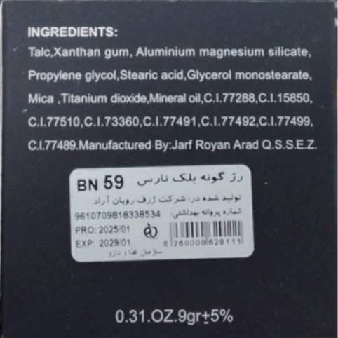 رژگونه بلک نارس دارای پودری فشرده است که جلوه شاداب و جذابی روی سطح پوست ایجاد میکند. رنگدانههای پودری بسیار نرم و ابریشمی رژگونه بلک نارس در رنگهای مات و براق موجود هستند. این سایه های نرم قابلیت ترکیب بسیار بالایی داشته که رنگ جذاب و زیبایی روی پوست به وجود میآورند که همگی ته رنگ صورتی داشته و جلوهای بسیار طبیعی به آن میدهند. ژگونه بلک نارس با رنگهای منحصر بفردی که دارد برای کانتور نیز قابل استفاده هستند. همین ترکیب روی پوستهای تیرهتر درخشش و برق بیشتری به پوست داده و چهره را بشاشتر جلوه میدهد.